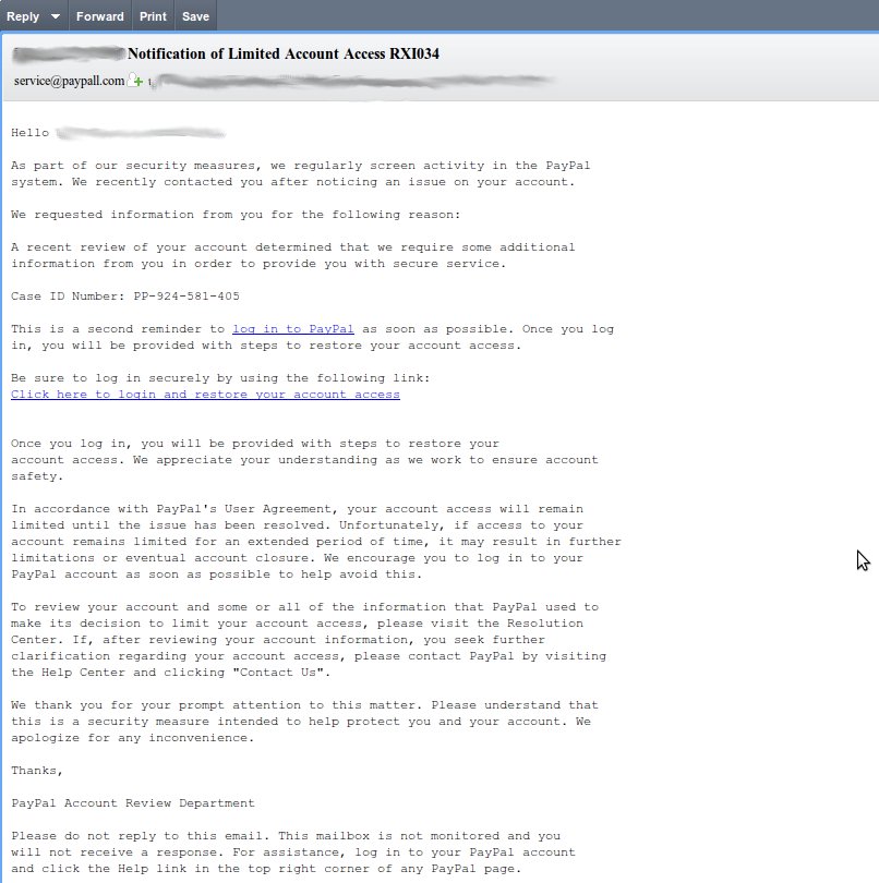 If youâre just logging into your Email to start this arduous task, be sure not to fall for a message that purports to be sent on behalf of Paypal with a subject line that reads ”Notification Of Limited Account Access RXI034”