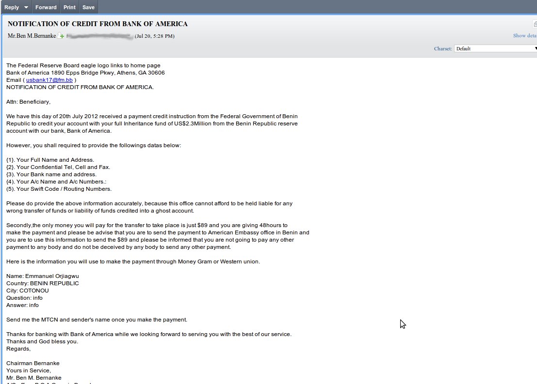 As you can see, this message is all over the place - even using the guise of an inheritance from the Government of Benin and using the name of Ben Bernanke as a the sender of this Email. To make a long story short, don’t provide any information to the Email addresses provided. Bank Of America doesn’t use Rocketmail or FM.bb to correspond with their clients. If you happen to get this message, be sure to delete it immediately and get on to your next order of business.