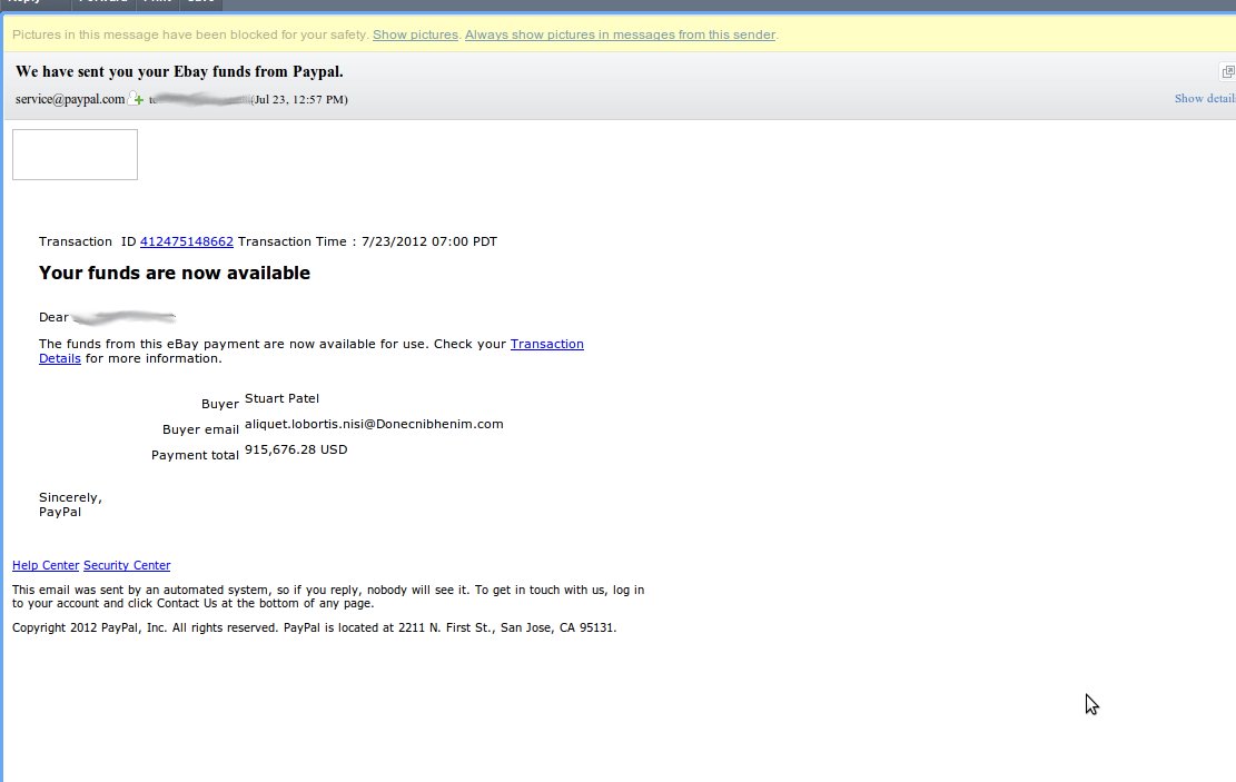 That is the case with this Email message that purports that $915,676.28 USD is available ‘for use.’ Be on the lookout for a subject line that reads “We have sent you your Ebay funds from Paypal.”