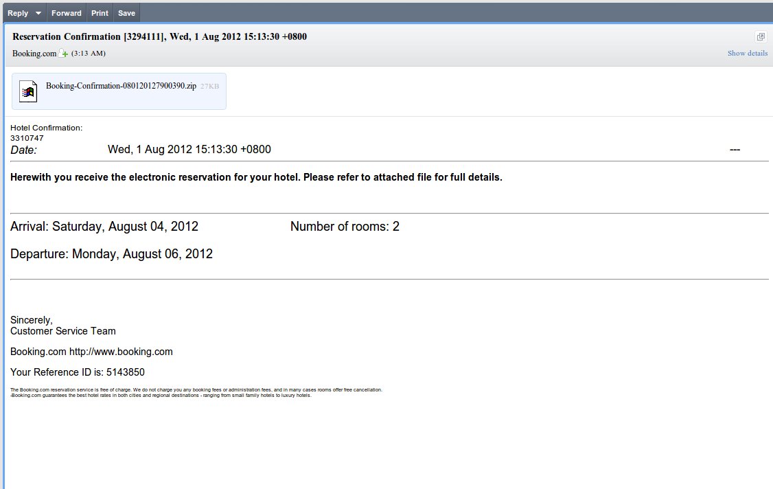 If you’re just having a look around your unfiltered Email box and you came across a message that purports to be sent on behalf of Booking.com with a subject line that reads “Reservation Confirmation [3294111], Wed, 1 Aug 2012 15:13:30 +0800” Don’t make the mistake of clicking on the file attachment, as this likely contains malicious code geared towards stealing your personal information.