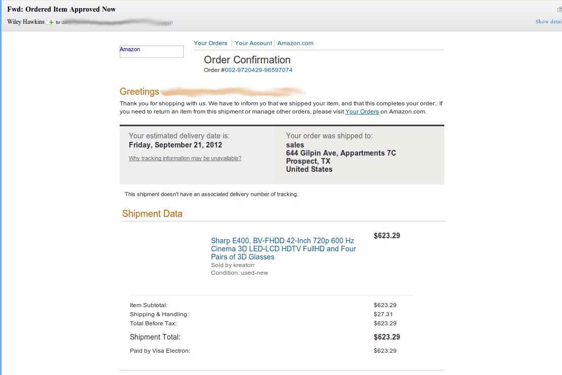 The Email message contains at least 10 bogus links that can put your computer at risk for phishing or malware attempts. Simply put, if you get this mail be sure to delete it immediately to avoid any complications that it can cause - because let’s face it, you already know that you didn’t order a television and ship it to “Sales” in Albuquerque, Washington - because there is no such place.