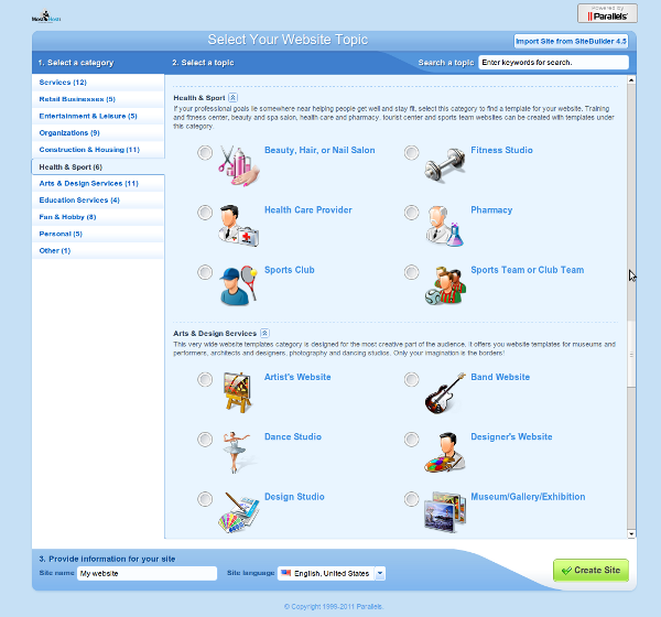 Choose from a number search engine friendly templates to easily create websites for beauty salons, restaurants, schools, accounting services, gyms and fitness studios, dance studios, artist websites, band websites, home repair services, personal websites, roofing services, health care providers, sports teams, home decorators, flooring services, plumbers and others.