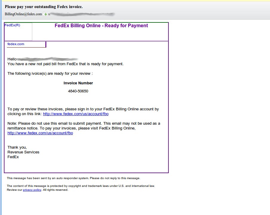 If you recently checked your Email and found a suspicious looking Email with the subject line ‘Please Pay Your Outstanding Fedex Invoiceâ be sure to immediately delete this message and certainly avoid clicking on any of the links provided in the Email.