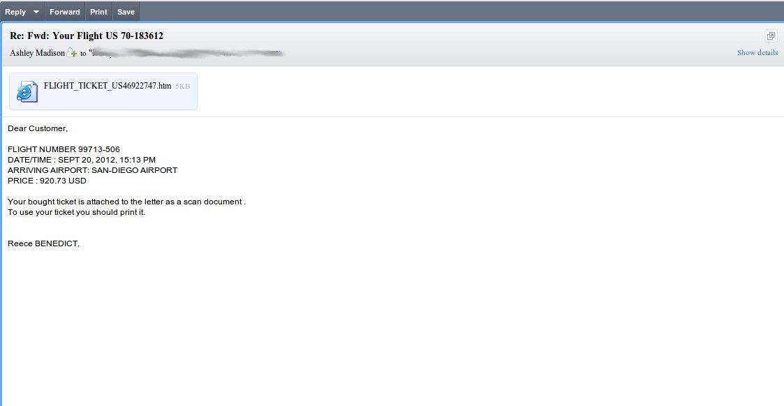 If you’re just getting back to work after enjoying the closing ceremonies of the Olympics, don’t let the overhang of the weekend make you vulnerable to a fraudulent Email with the subject line ‘Your Flight US 70-183612′ that likely contains a virus or other malware in a file attachment.